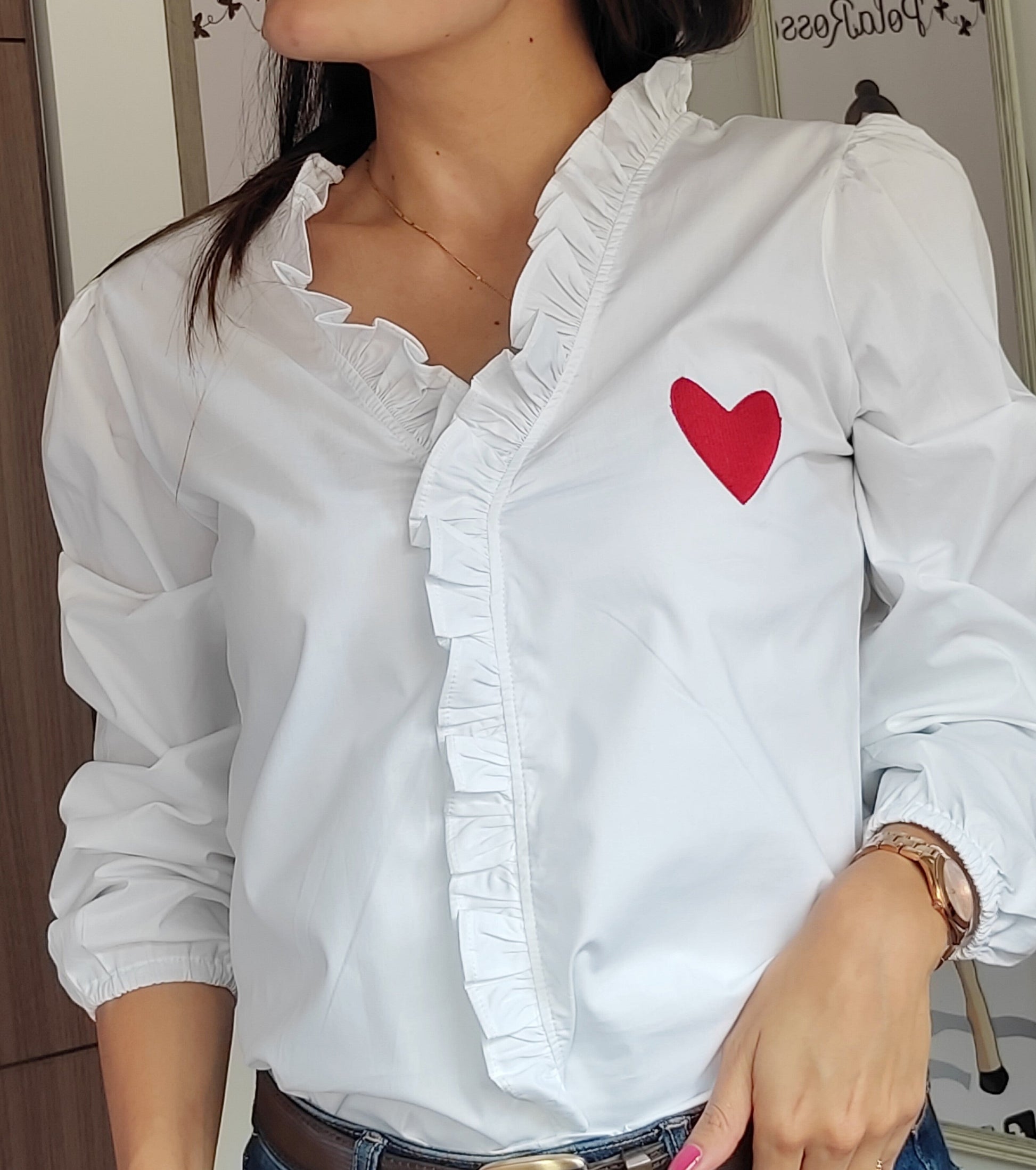Camisa para mujer elaborada en algodón camisero. Corazón lineal, rostro mujer y texto bordados. Manga con diseño de campana recogida en prensas y cuerdita para anudar.